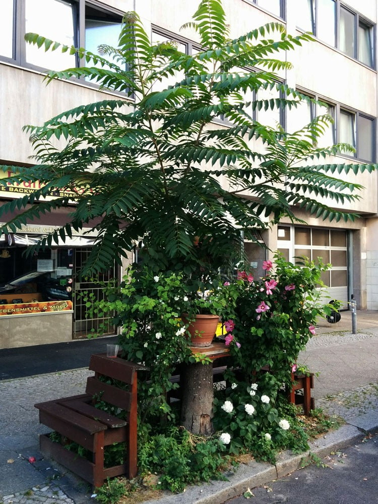 Moet ik nu voor of tegen de hemelboom zijn? Ik had er tot voor twee jaar terug één in mijn tuin. Net zoals veel soortgenoten een zaailing die tegen mijn gevel omhoogschoot en daardoor fungeerde als een natuurlijk zonnescherm. De eigenaar van het gebouw was er minder gelukkig mee en gaf opdracht de boom om te zagen. Eigenlijk verlang ik wel terug naar mijn gettopalm. Ik hoef er gelukkig niets voor te doen. Deze zomer hebben enkele nieuwe zaailingen langs mijn gevel al een hoogte van een meter bereikt!