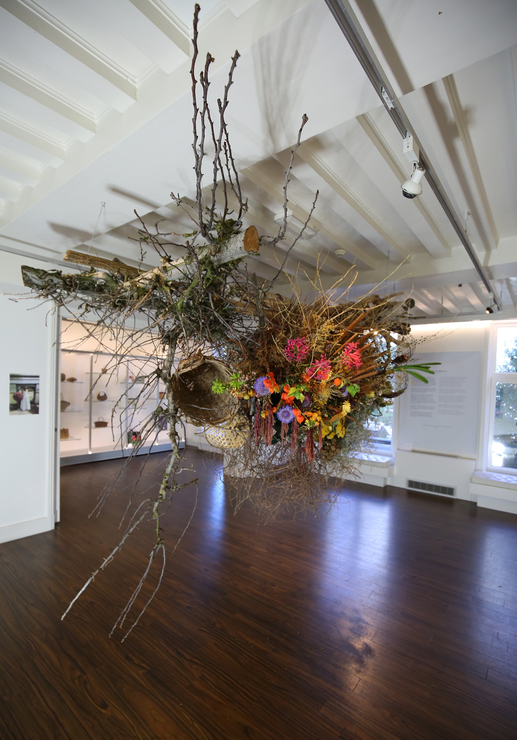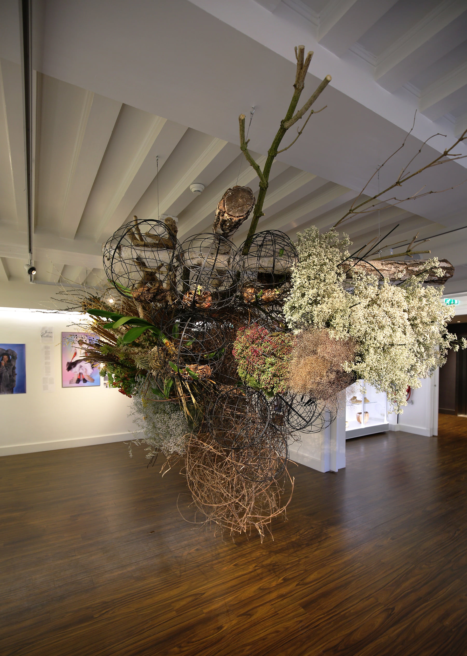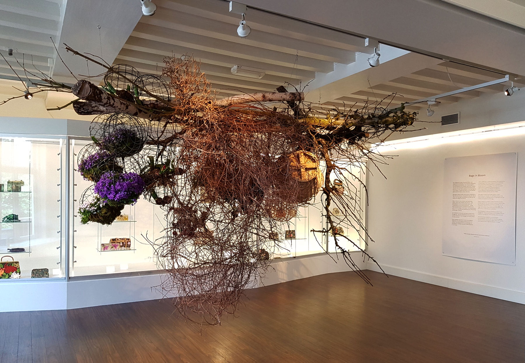NL Voor de thematentoonstelling Bags in bloom – over florale en plantaardige motieven die in tassen kunnen worden ontdekt – werd een ruimtevullend hangend natuurobject vervaardigd. Het object bestaat enerzijds uit houtachtige materialen en anderzijds uit gevlochten manden. Het object wordt periodiek “gevuld” met verse bloemen en planten waardoor het seizoen het museum in wordt gebracht. |