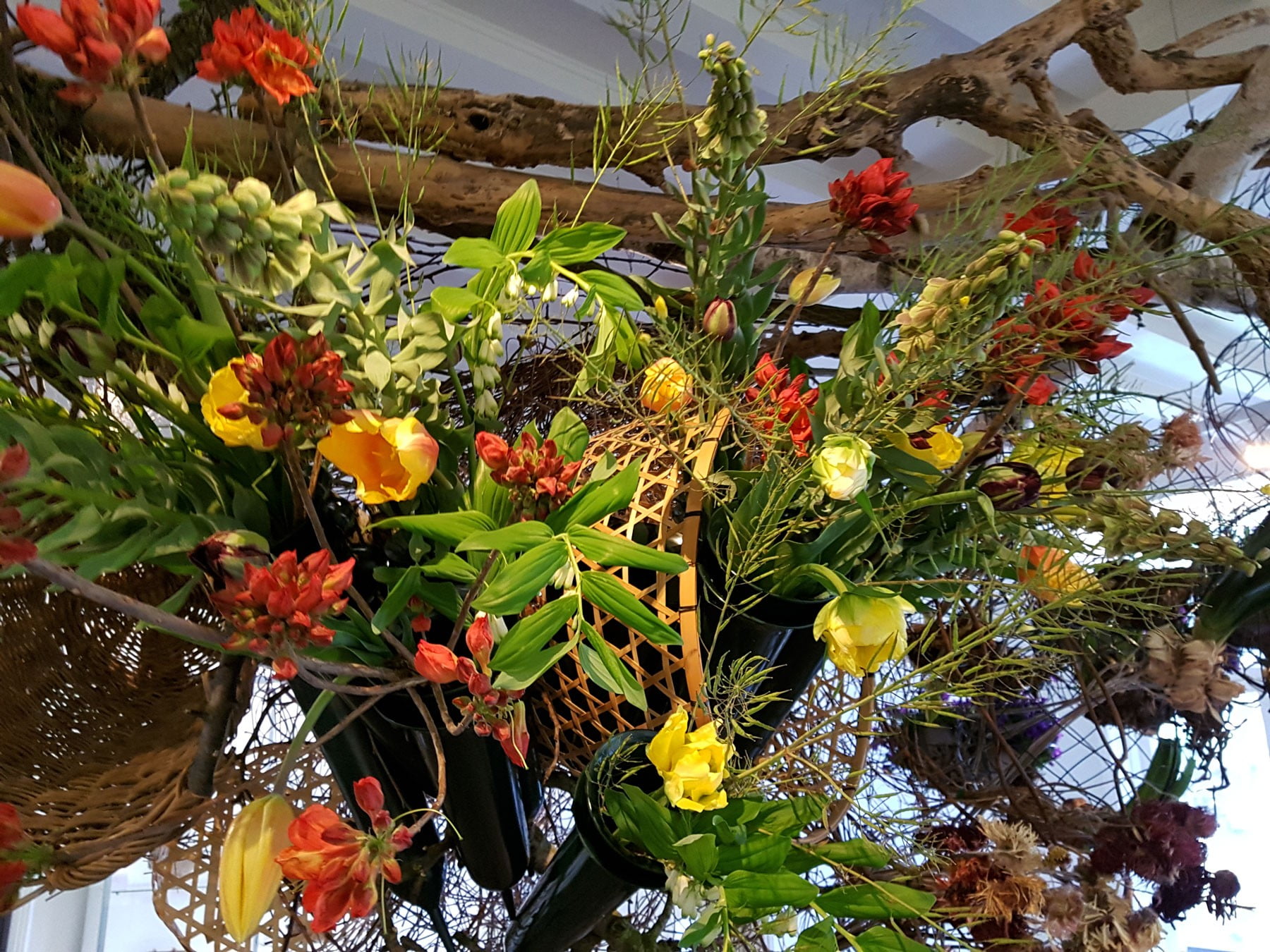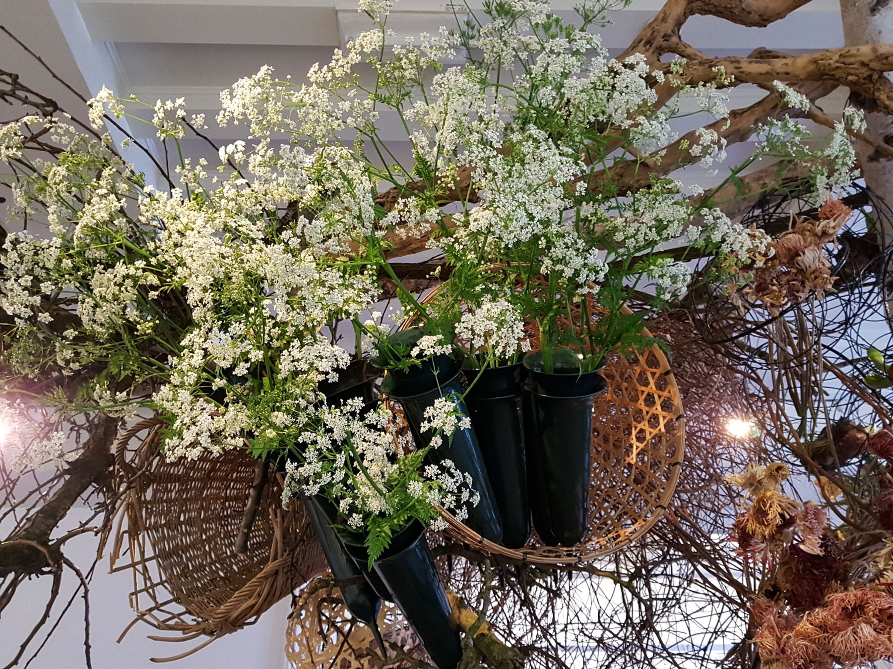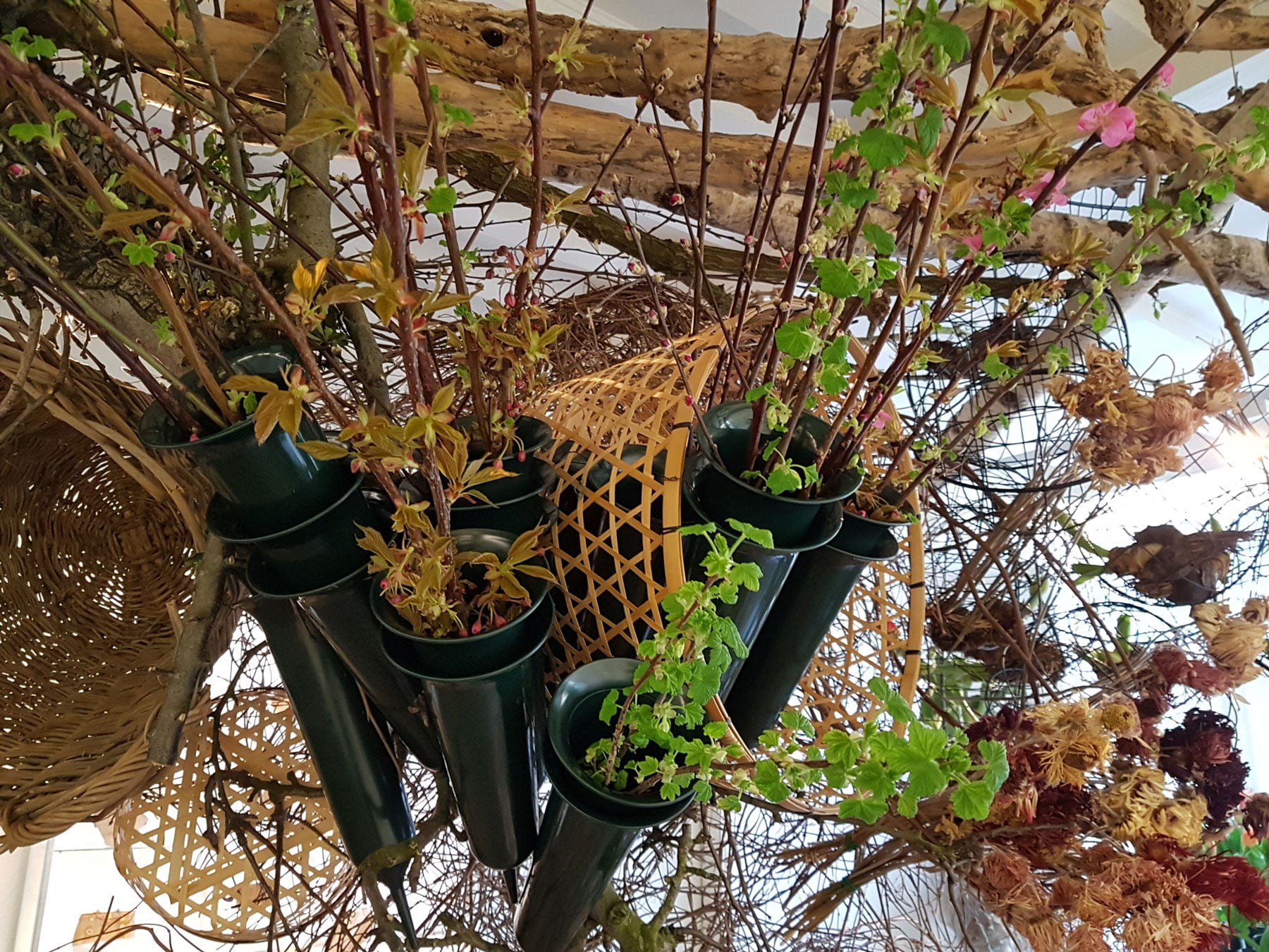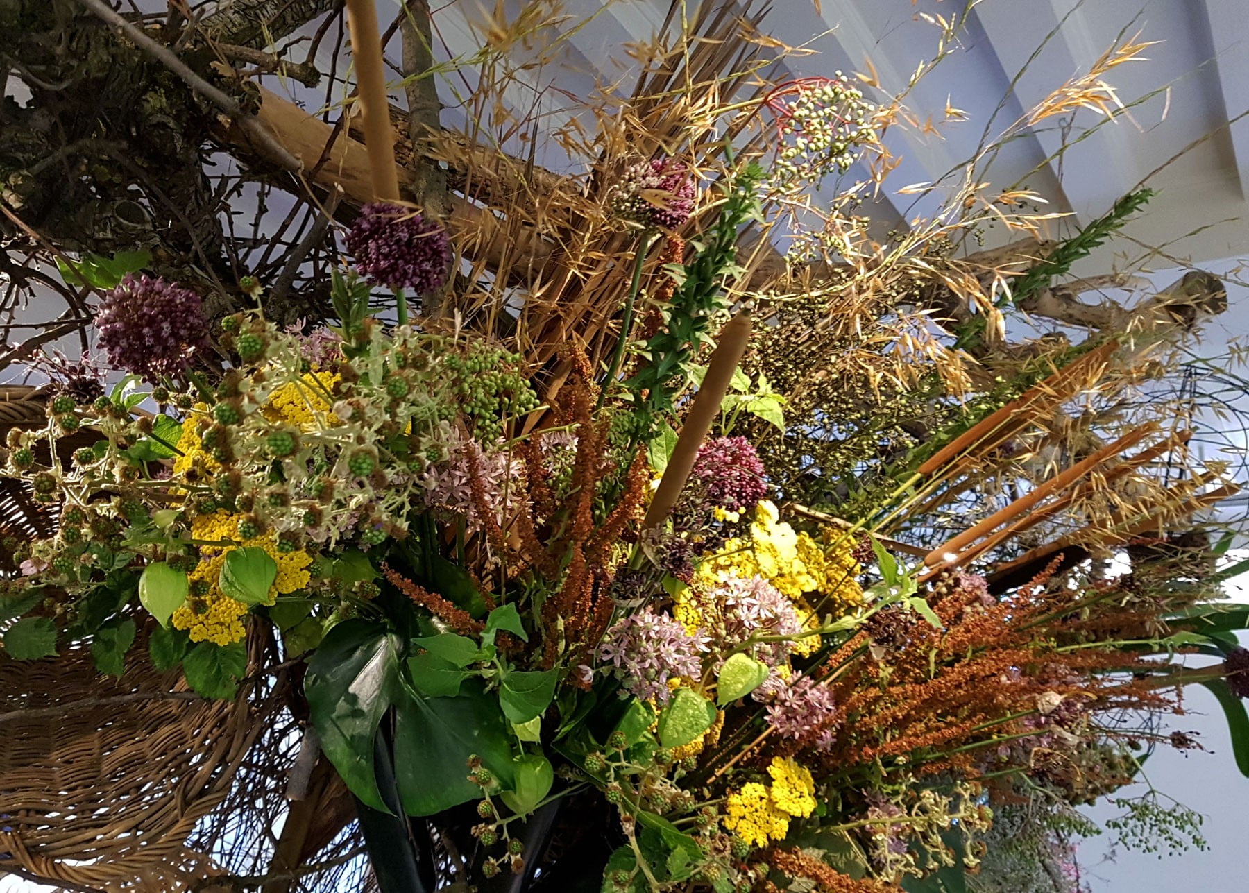 EN For the exhibtion Bags in bloom – about floral and botanical motifs that have inspired bag makers and designers – a spacious and hanging nature object was made. The carrier material of this object consists of wooden trunks and shrubs supplemented with woven baskets. The object is periodically “filled” with fresh flowers and plants, bringing the season into the museum. |