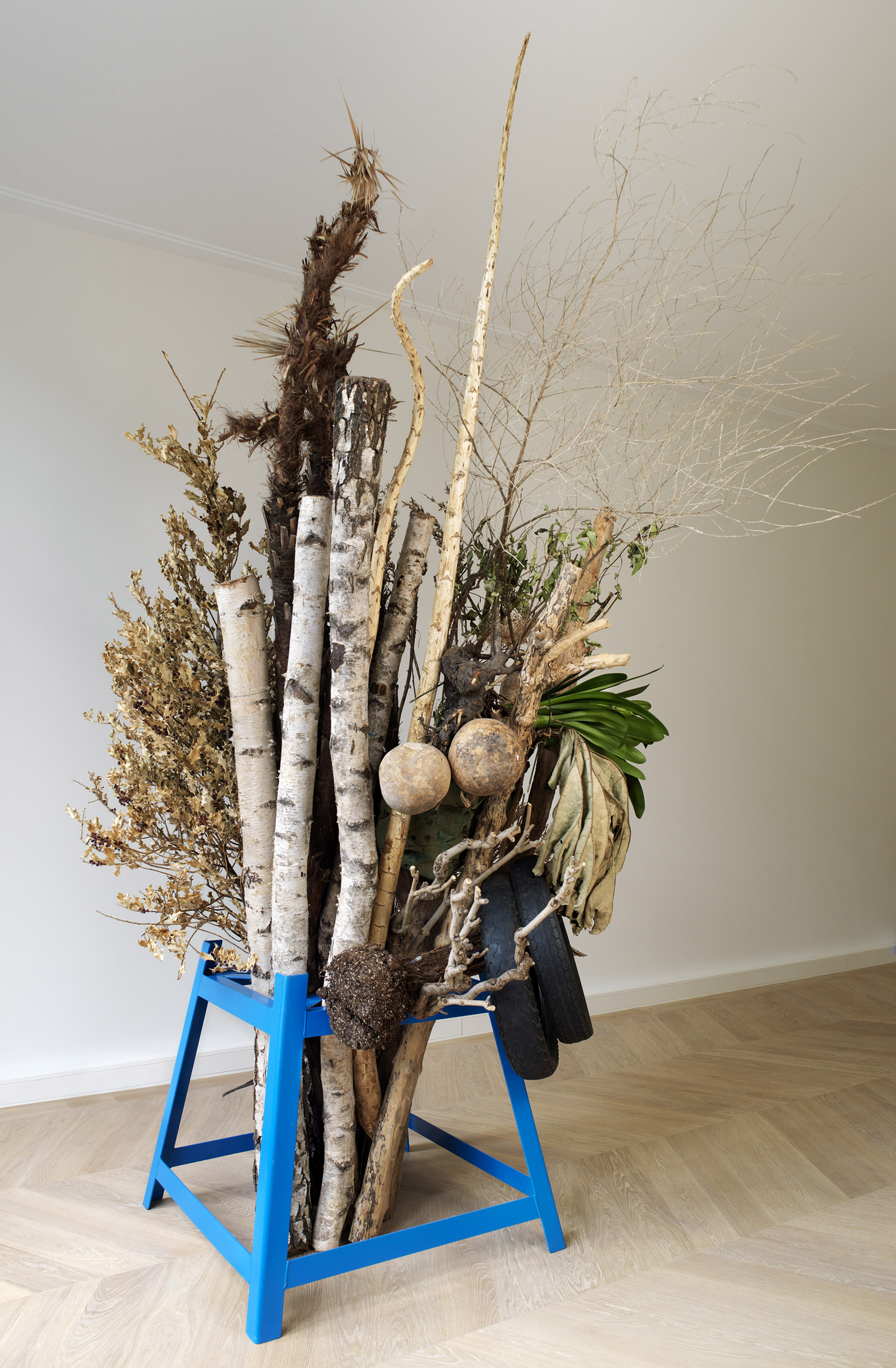 Natureobject #18, lacks any floral content. Instead it comprises a great variety of dead plant materials from indigenous and exotic plants, bushes and trees. Bruggeman has added some living plants as well. The blue metal frame, normally a frame for a plant container, is turned around and holds everything together and is now functioning as a kind of garden fence. Like so many gardens, this nature object radiates complete freedom: any plant that pleases the eye could have been chosen. There are no strict rules or planting schemes; accidence plays an important part in the composition. Just like an ordinary backyard garden it even contains stuff that is not botanical at all, in this case some discarded car tires.