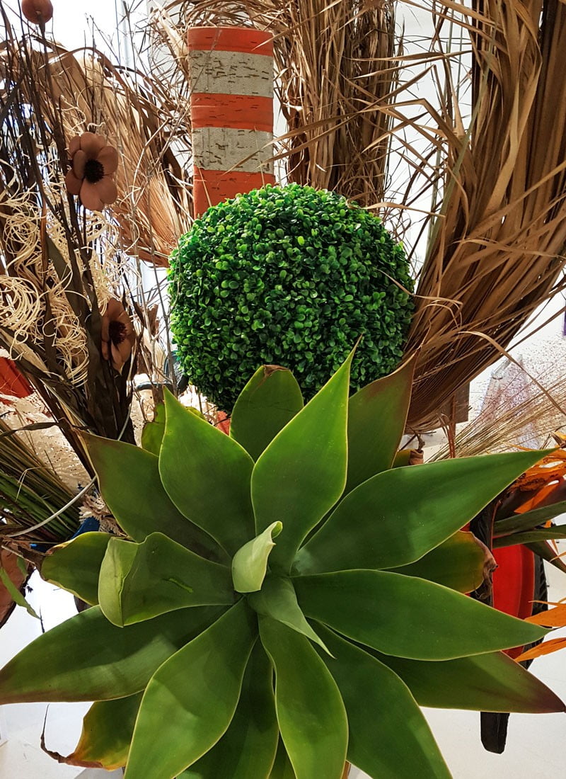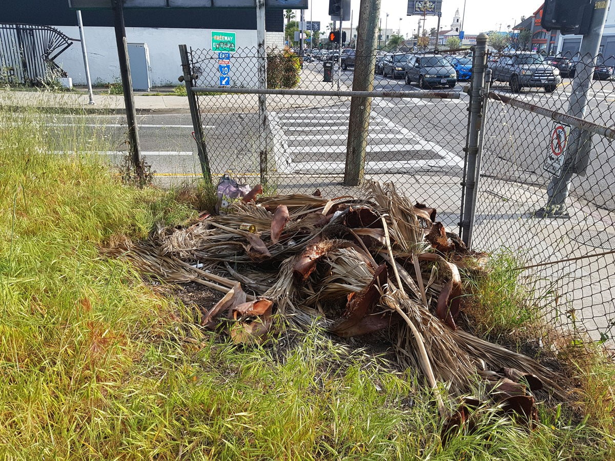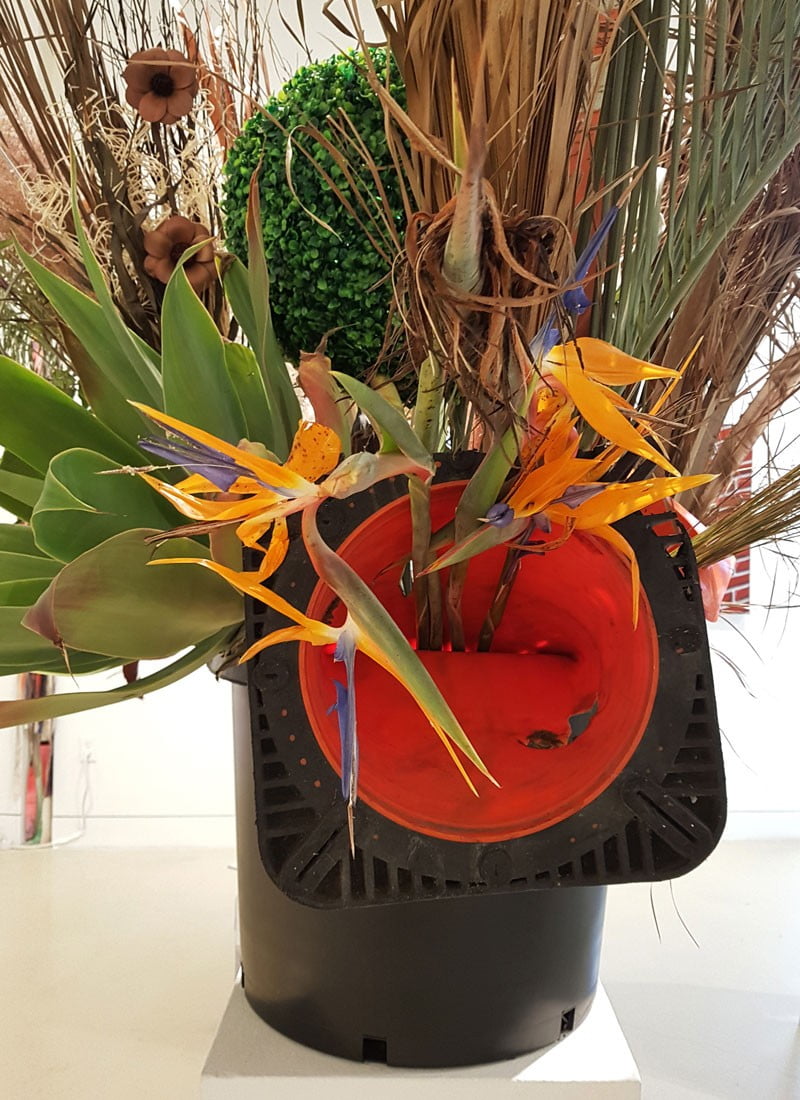 EN Natureobject #19 is a botanical and cultural account of a week’s stay in Los Angeles. The object consists, among other things, the remains of the many palm trees that grow in the city. These palm trees are iconic to LA, but the question is how long they will remain that way, because a beetle and a fungus are life-threatening pests. Also included in this assembly are dried flowers and a plastic boxwood bush from the local Home Depot store. Very characteristic of the area are the numerous succulents and cacti in large sizes. Fragments of these native exotic species have been incorporated as a defining element, as well as a discarded car tire and barrier materials for road maintenance that characterize this city designed for the car. |
